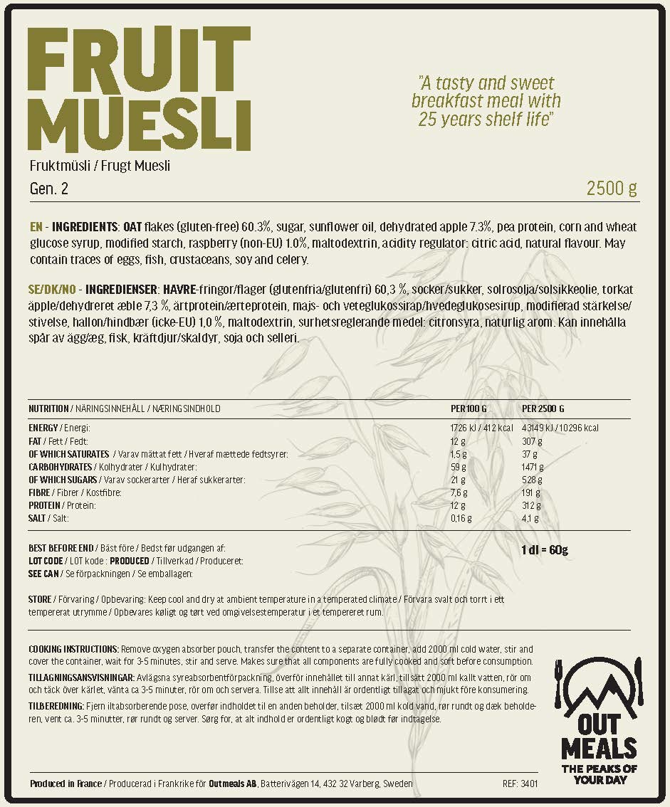 Our concept of freeze-dried foods with long shelf life in bulk packaging, where each package contains 18-25 servings depending on the type of meal. Main courses are prepared with hot water and are ready in about 10-12 minutes. Many of our breakfast dishes can be eaten as they are with cold water, which is useful in situations where you may not have backup power but still need to deliver meals quickly.